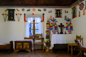 KADZIDLO, MASOVIA, POLAND – March 23, 2024: Interior of cottage with Easter decorations in open-air museum with traditional houses from Kurpie in Kadzidlo, ethnic region in Poland